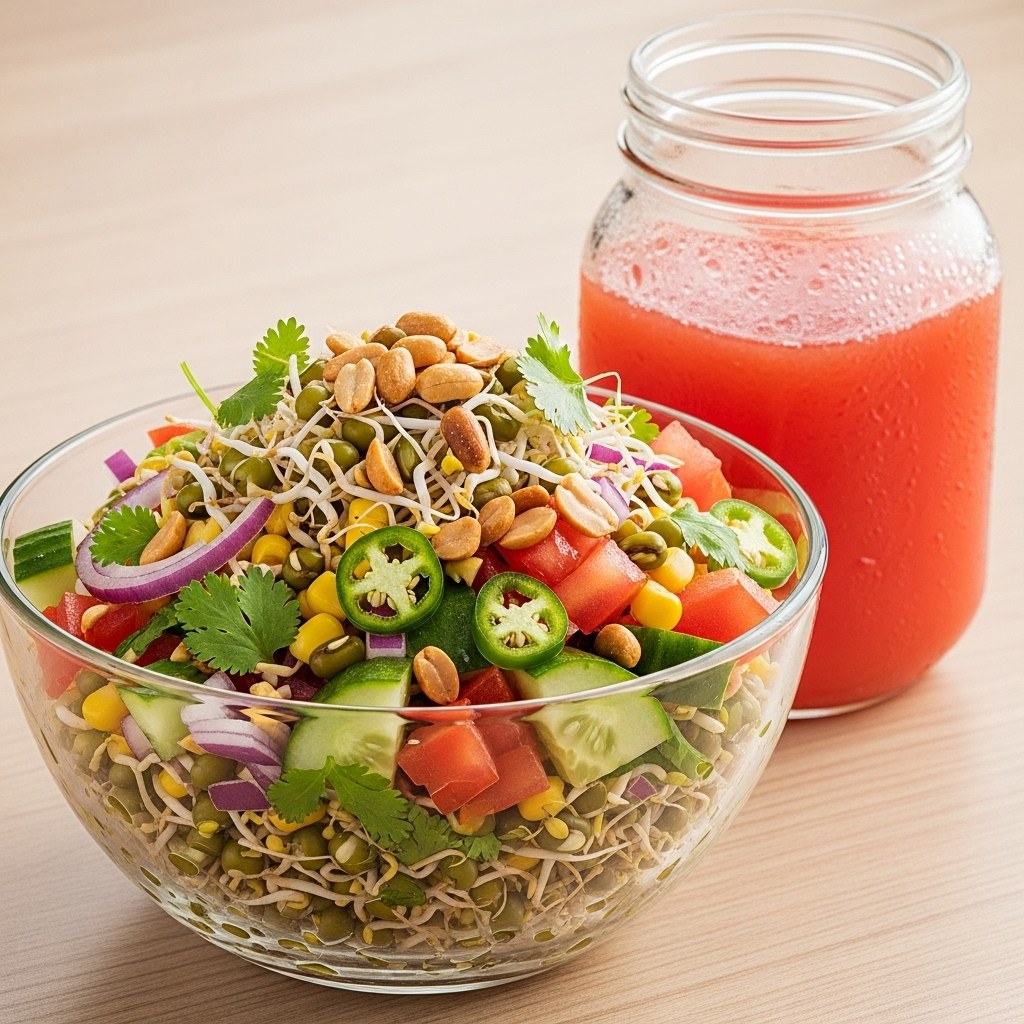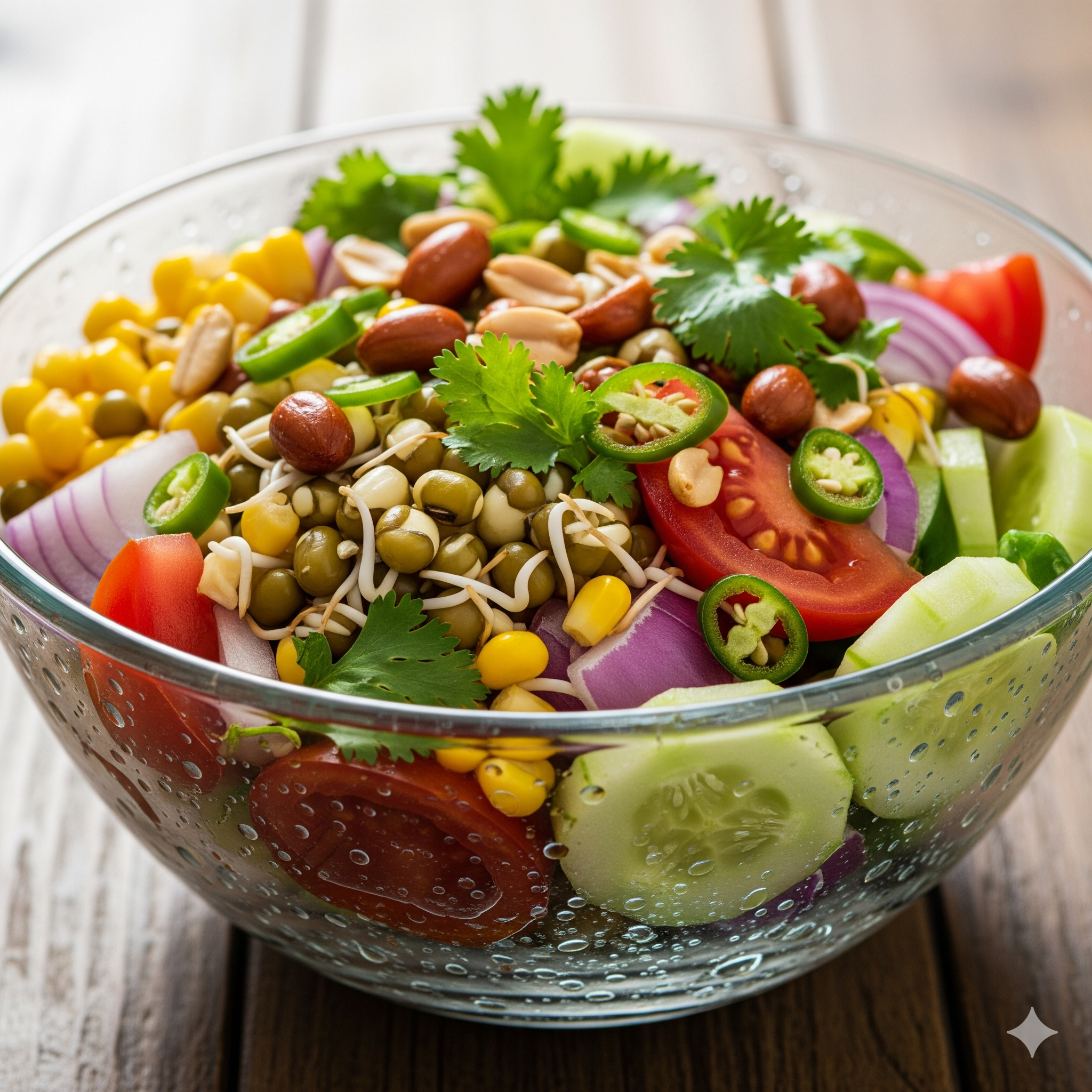 A tangy and protein-rich classic with sprouted moong, boiled corn, onion, tomato, cucumber, green chilies, coriander leaves, and roasted peanuts.