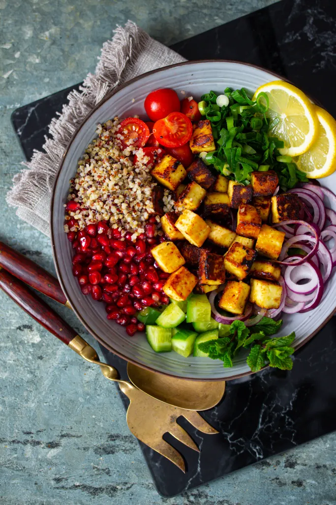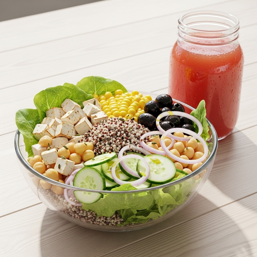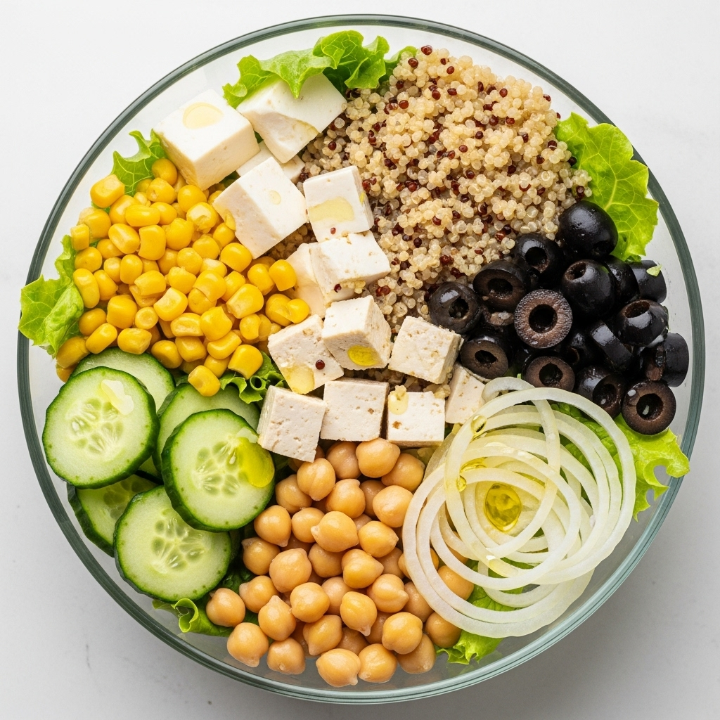 A complete meal with protein and fibre. Made with quinoa, boiled corn, lettuce, tofu, boiled chickpea, cucumber, onion, olives & olive oil.